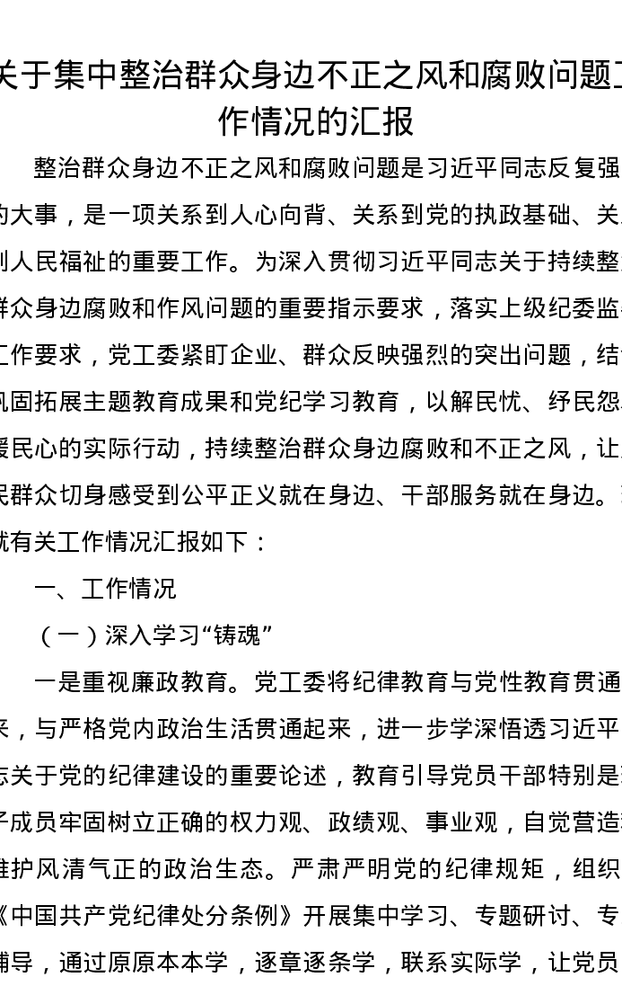 关于集中整治群众身边不正之风和腐败问题工作情况的汇报