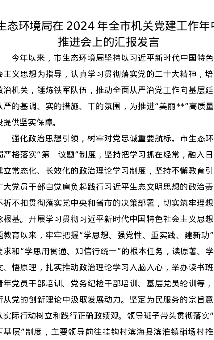 生态环境局在2024年全市机关党建工作年中推进会上的汇报发言