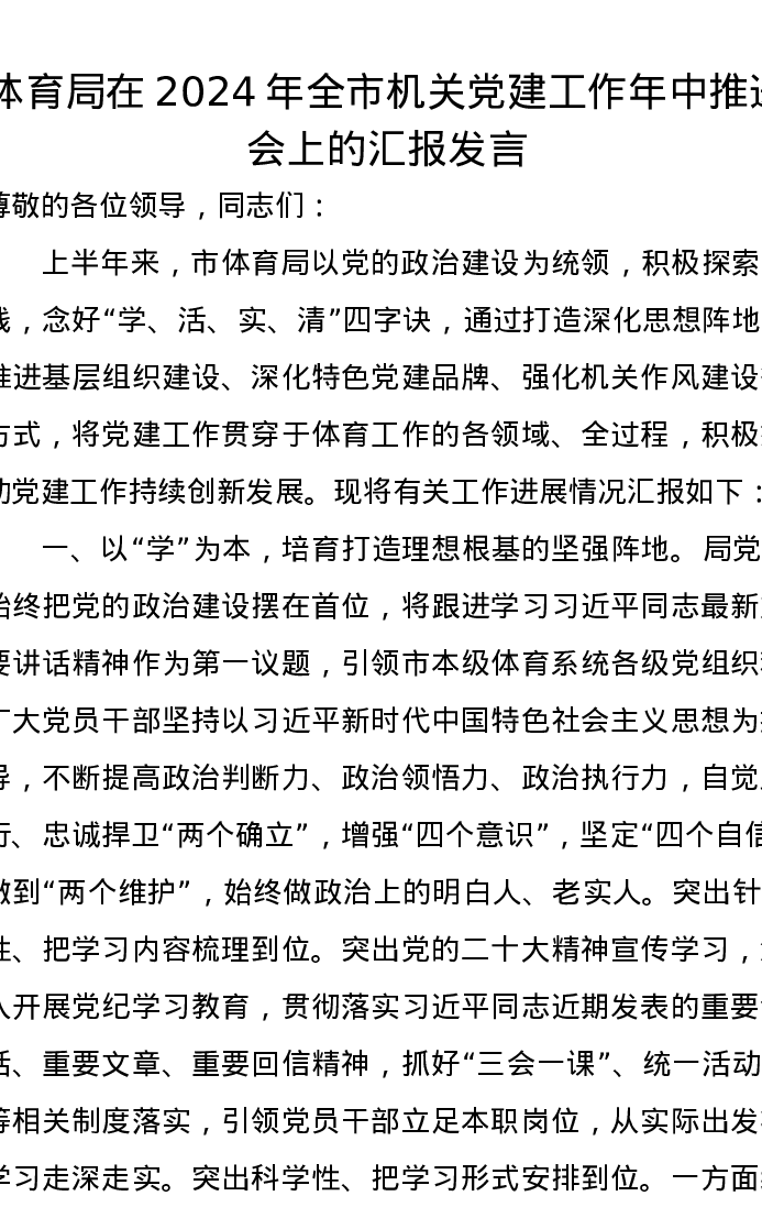 体育局在2024年全市机关党建工作年中推进会上的汇报发言