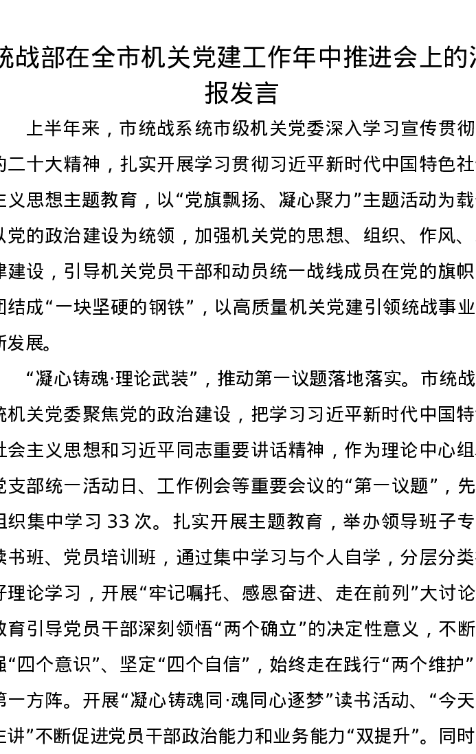 统战部在全市机关党建工作年中推进会上的汇报发言