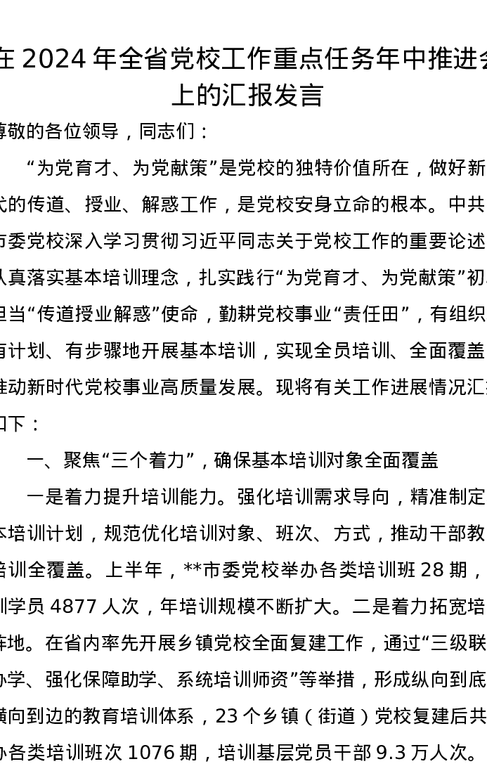 在2024年全省党校工作重点任务年中推进会上的汇报发言