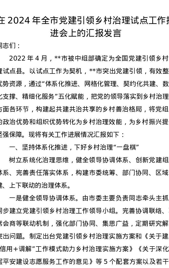 在2024年全市党建引领乡村治理试点工作推进会上的汇报发言