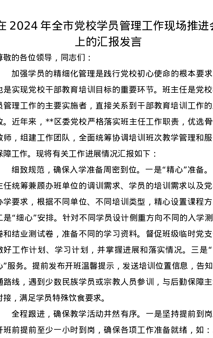 在2024年全市党校学员管理工作现场推进会上的汇报发言