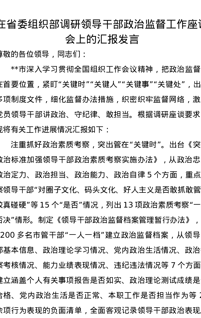在省委组织部调研领导干部政治监督工作座谈会上的汇报发言