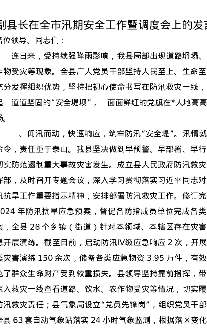 副县长在全市汛期安全工作暨调度会上的发言