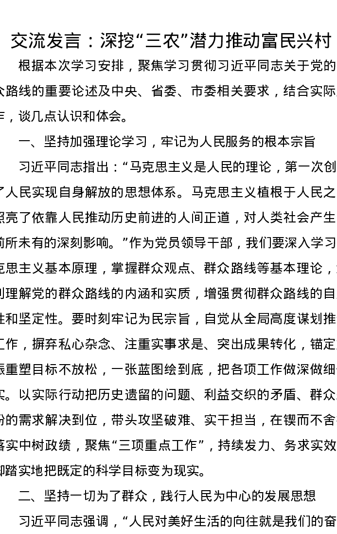 交流发言:深挖“三农”潜力推动富民兴村