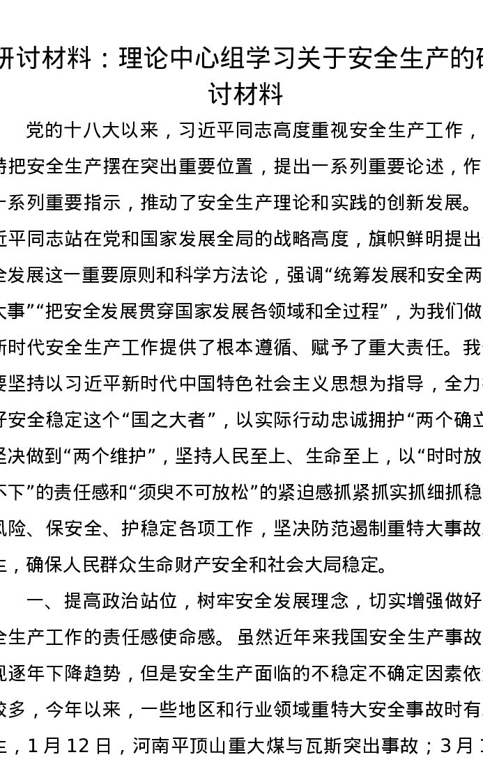 理论中心组学习关于安全生产的研讨发言材料