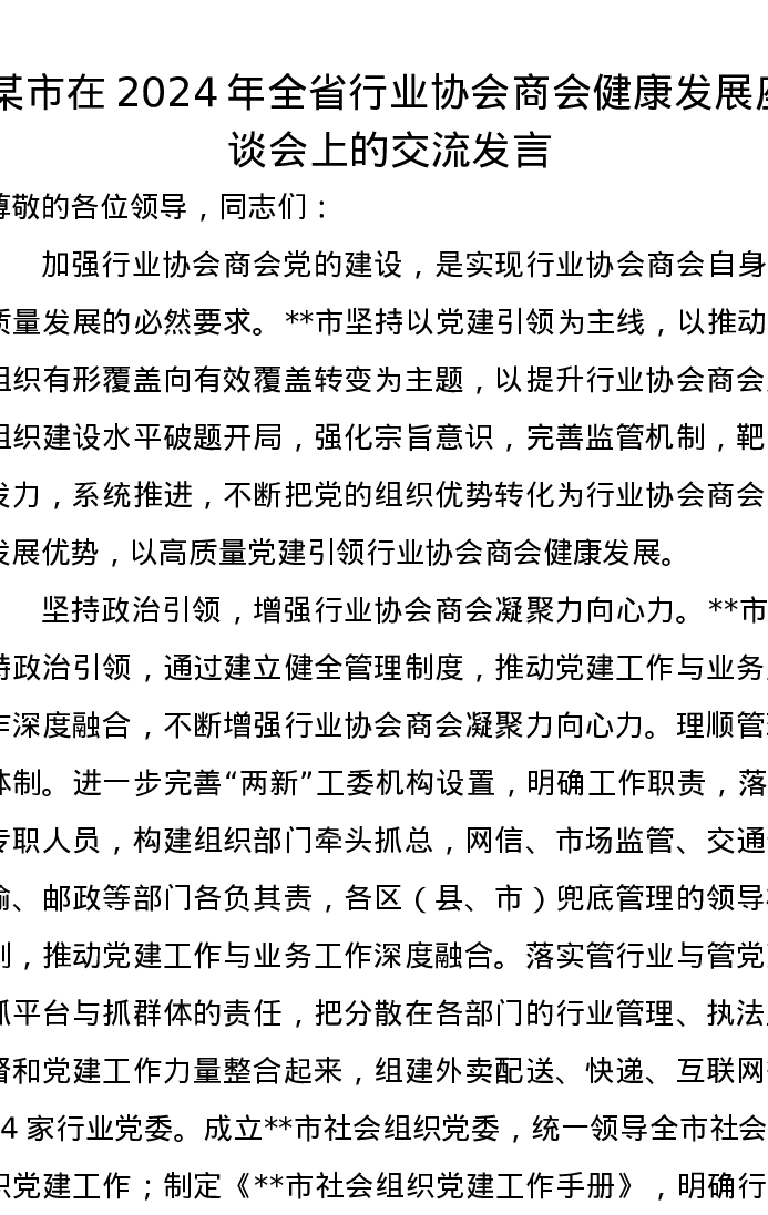 某市在2024年全省行业协会商会健康发展座谈会上的交流发言
