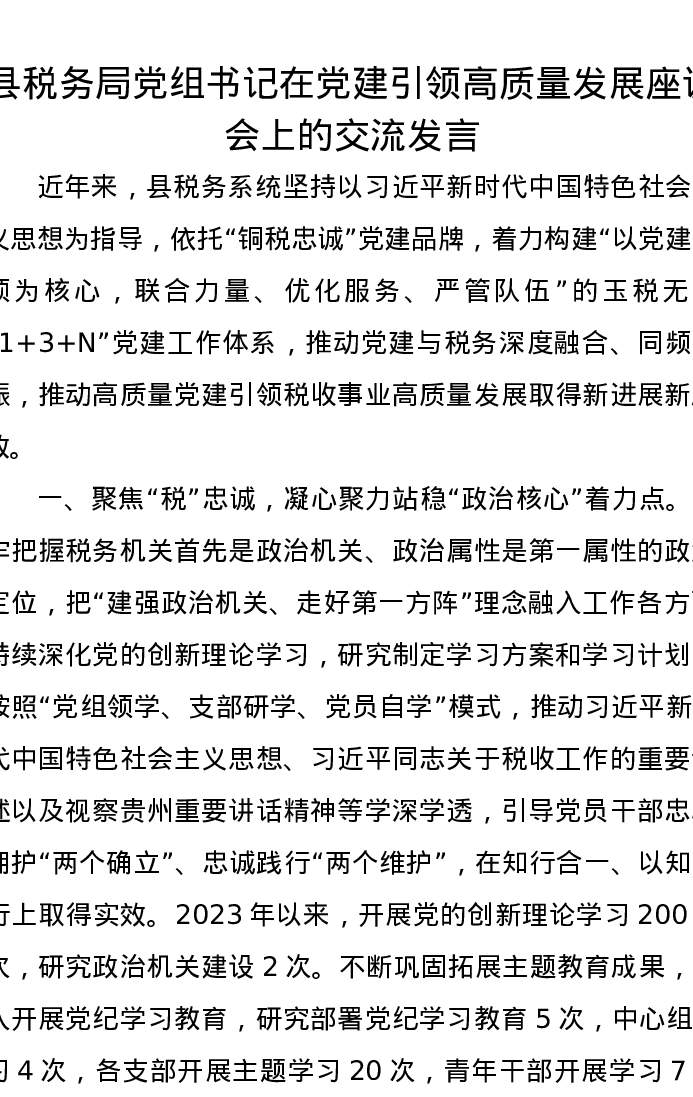 县税务局党组书记在党建引领高质量发展座谈会上的交流发言