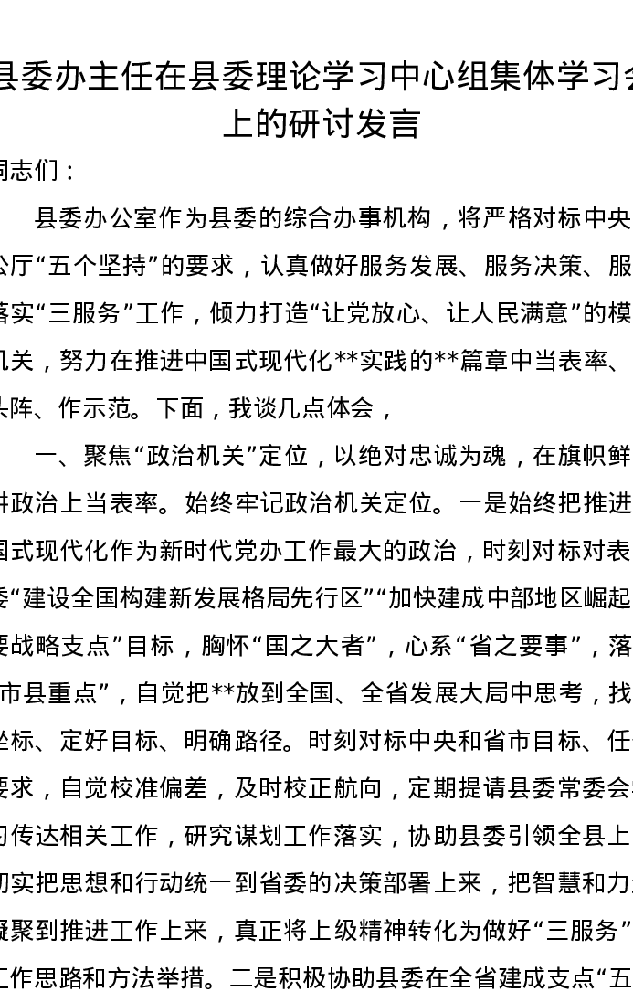 县委办主任在县委理论学习中心组集体学习会上的研讨发言