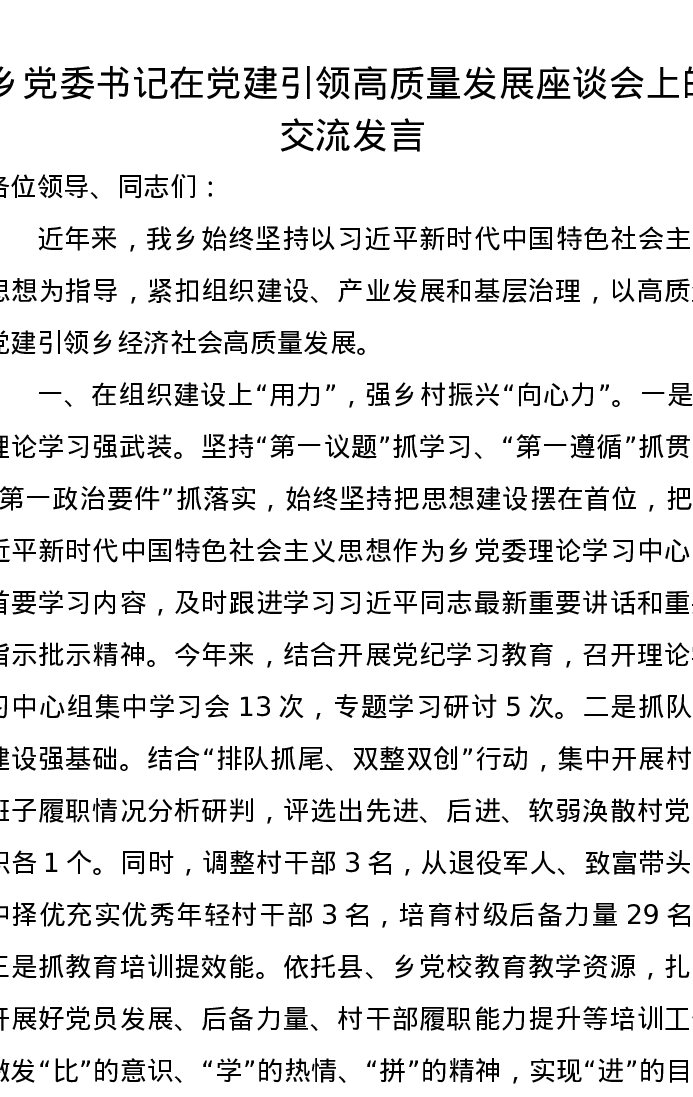乡党委书记在党建引领高质量发展座谈会上的交流发言