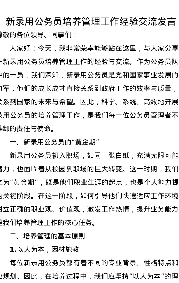 新录用公务员培养管理工作经验交流发言
