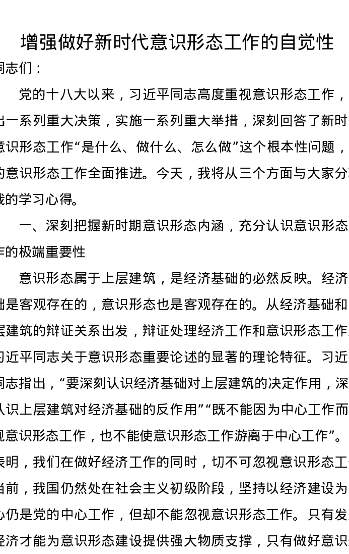 意识形态中心组发言:增强做好新时代意识形态工作的自觉性