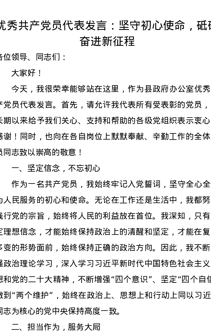 优秀共产党员代表发言:坚守初心使命,砥砺奋进新征程