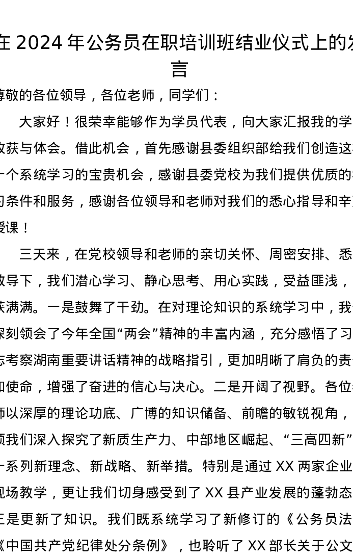 在2024年公务员在职培训班结业仪式上的发言