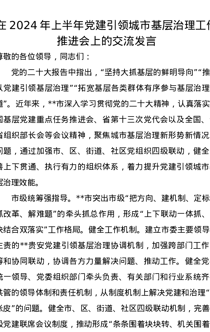 在2024年上半年党建引领城市基层治理工作推进会上的交流发言