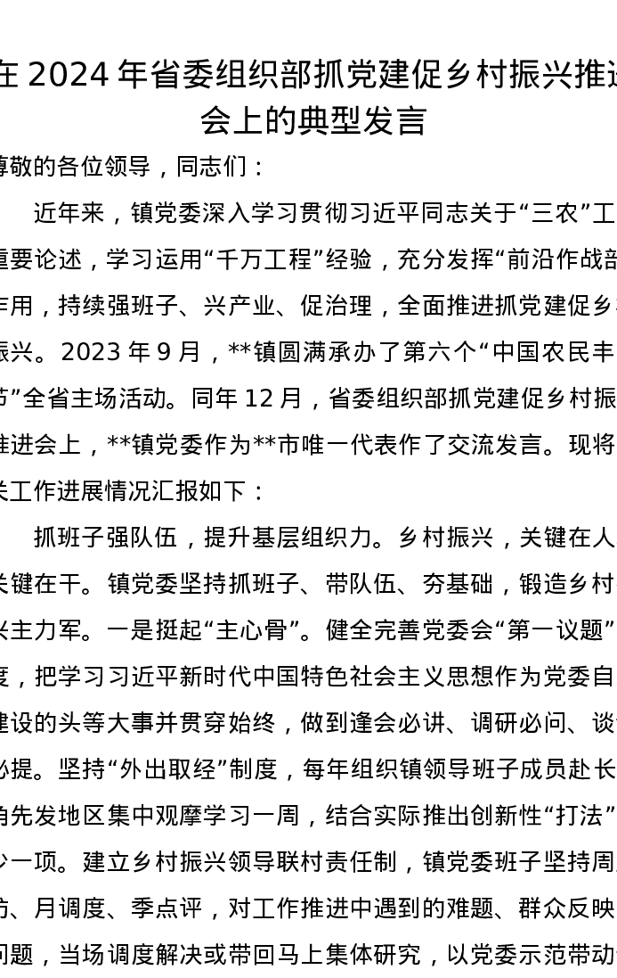 在2024年省委组织部抓党建促乡村振兴推进会上的典型发言