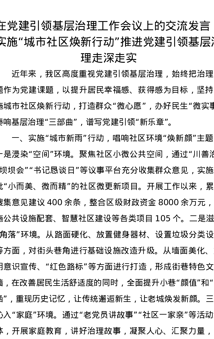 在党建引领基层治理工作会议上的交流发言:实施“城市社区焕新行动,推进党建引领基层治理走深走实