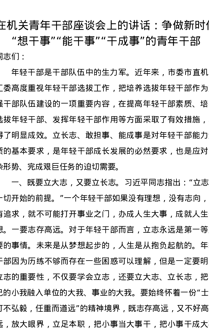 在机关青年干部座谈会上的讲话:争做新时代“想干事”“能干事”“干成事”的青年干部