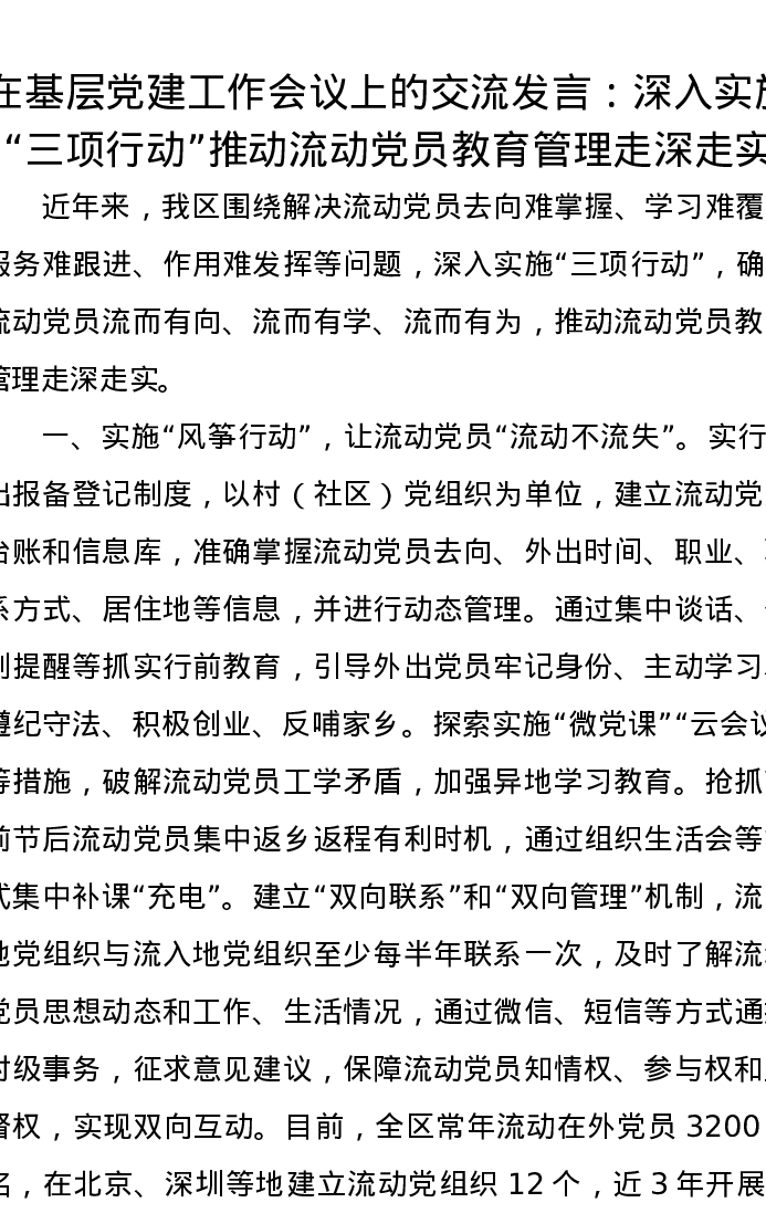 在基层党建工作会议上的交流发言:深入实施“三项行动”推动流动党员教育管理走深走实