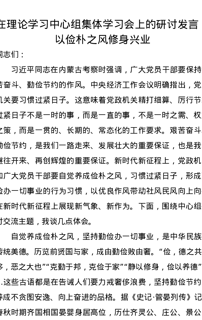 在理论学习中心组集体学习会上的研讨发言:以俭朴之风修身兴业