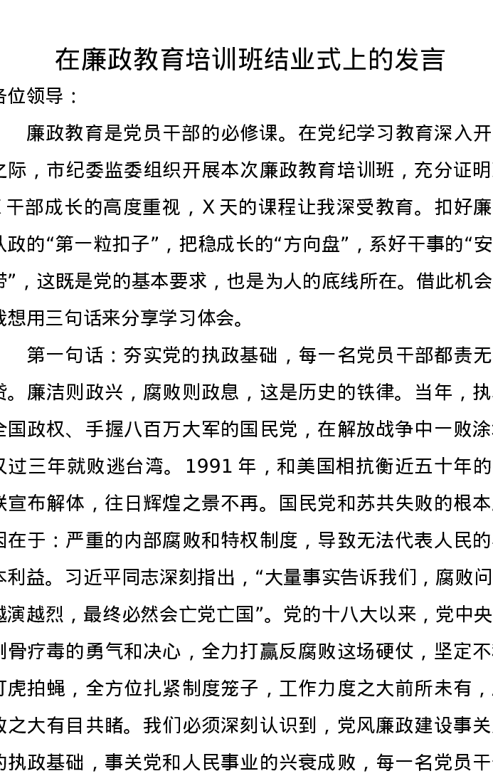 在廉政教育培训班结业式上的发言