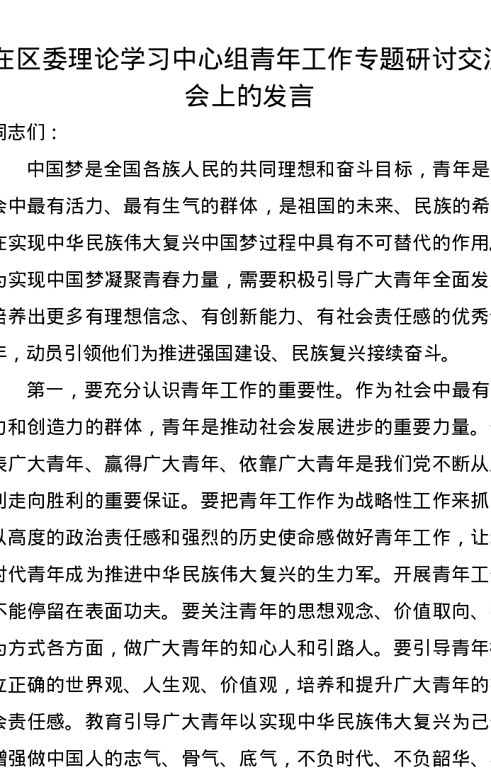 在区委理论学习中心组青年工作专题研讨交流会上的发言