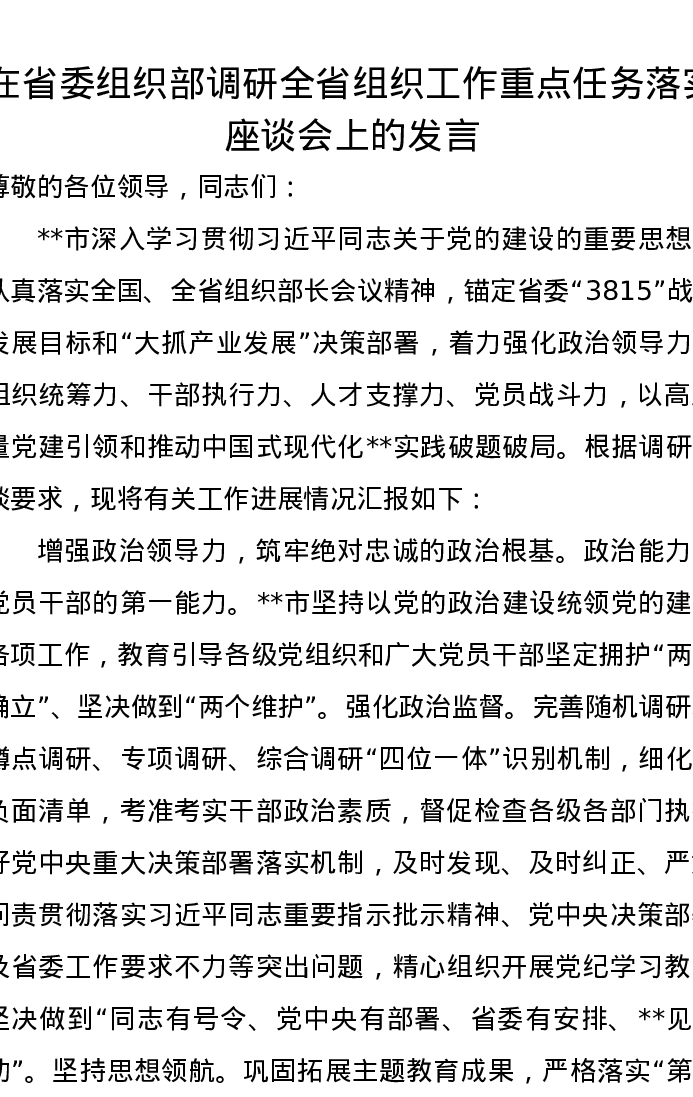 在省委组织部调研全省组织工作重点任务落实座谈会上的发言
