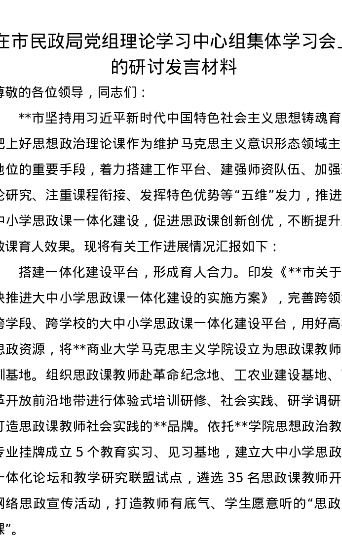 在市民政局党组理论学习中心组集体学习会上的研讨发言材料