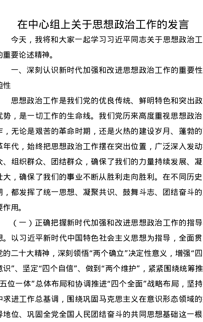 在中心组上关于思想政治工作的发言
