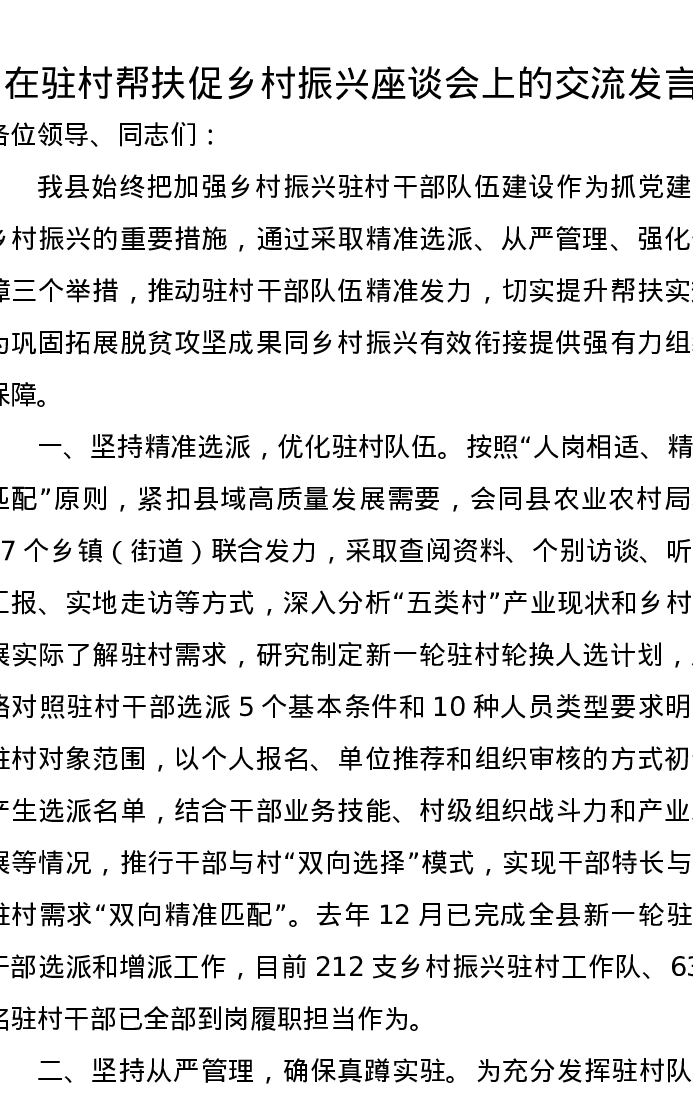 在驻村帮扶促乡村振兴座谈会上的交流发言
