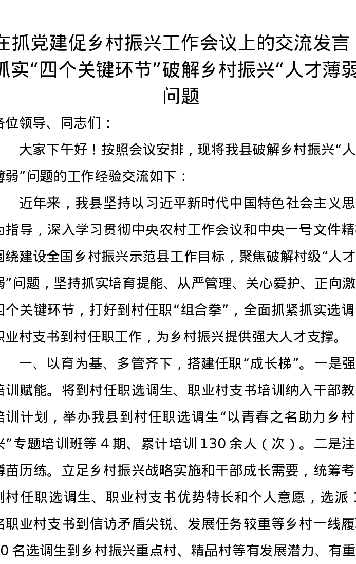 在抓党建促乡村振兴工作会议上的交流发言:抓实“四个关键环节”破解乡村振兴“人才薄弱”问题