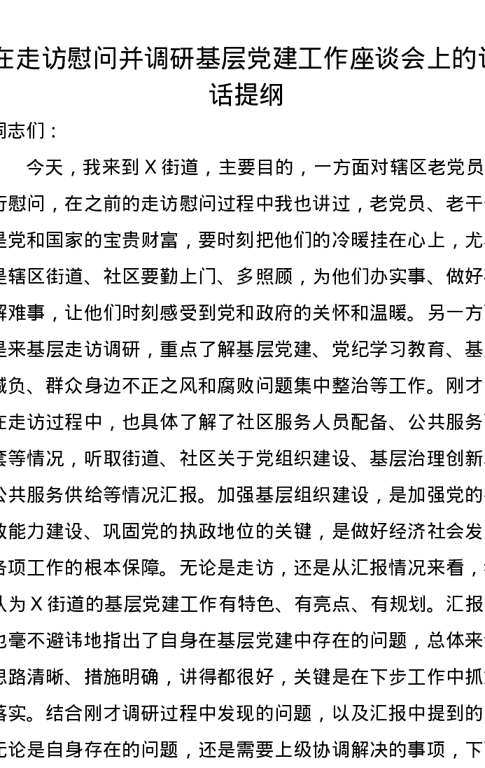 在走访慰问并调研基层党建工作座谈会上的讲话提纲