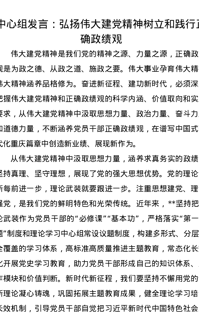 中心组发言:弘扬伟大建党精神树立和践行正确政绩观
