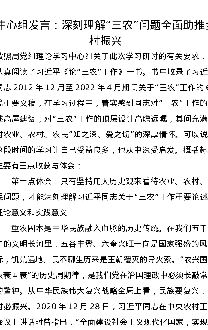 中心组发言:深刻理解“三农”问题全面助推乡村振兴