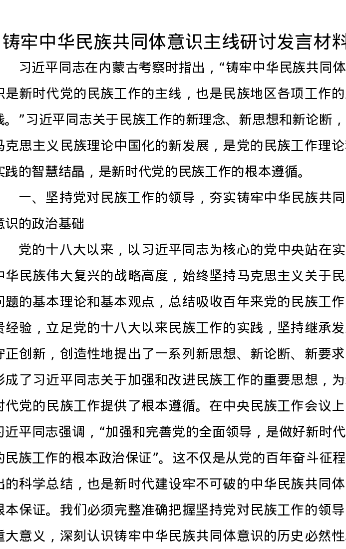 铸牢中华民族共同体意识主线研讨发言材料