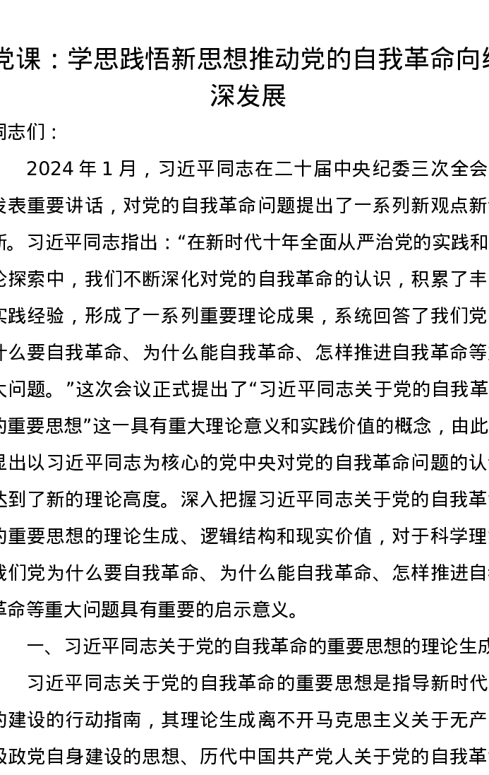 党课讲稿:学思践悟新思想推动党的自我革命向纵深发展