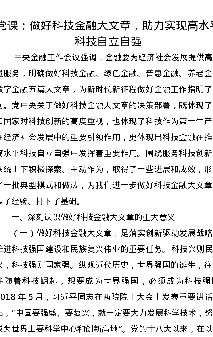 党课讲稿:做好科技金融大文章,助力实现高水平科技自立自强