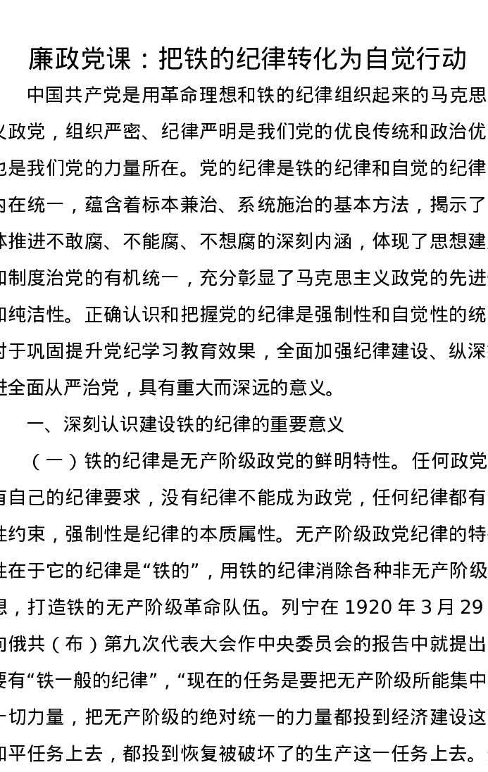 廉政党课讲稿:把铁的纪律转化为自觉行动