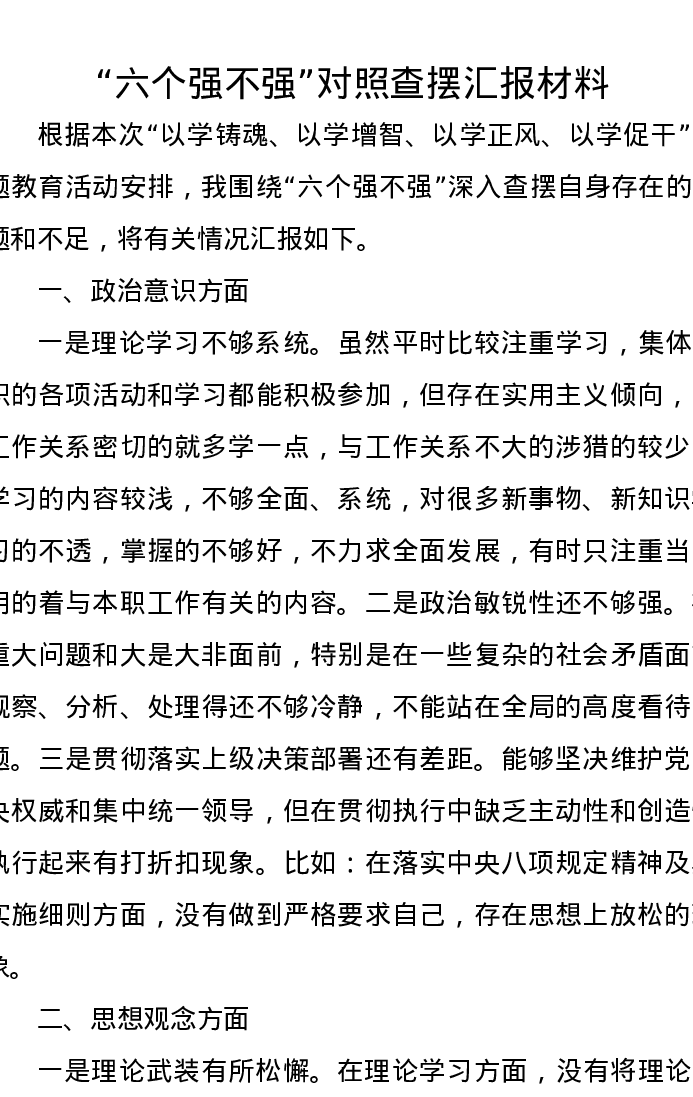 “六个强不强”对照查摆汇报材料