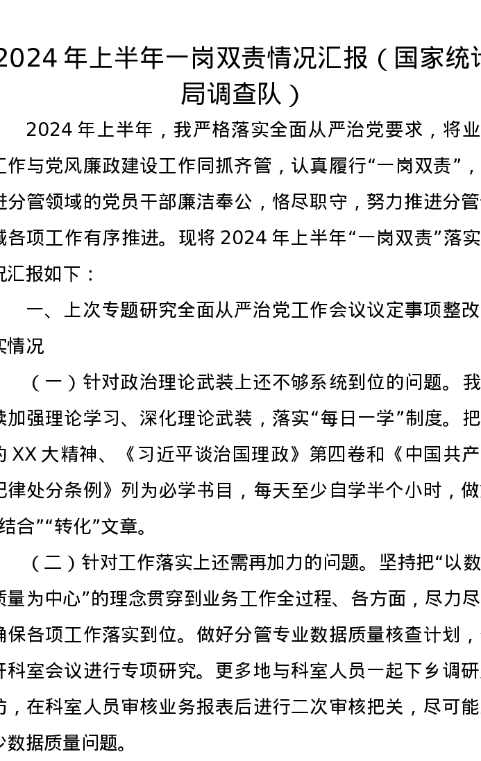 2024年上半年一岗双责情况汇报(国家统计局调查队)