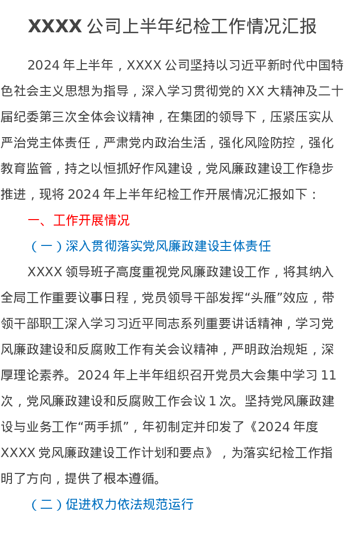 XX公司上半年纪检工作情况汇报
