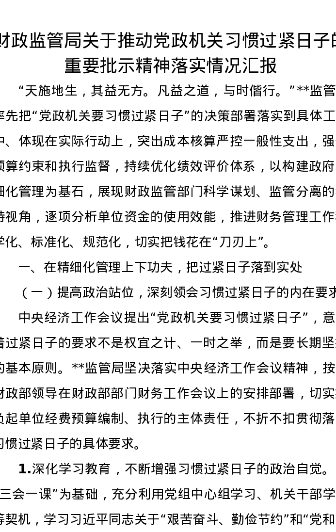 财政监管局关于推动党政机关习惯过紧日子的重要批示精神落实情况汇报