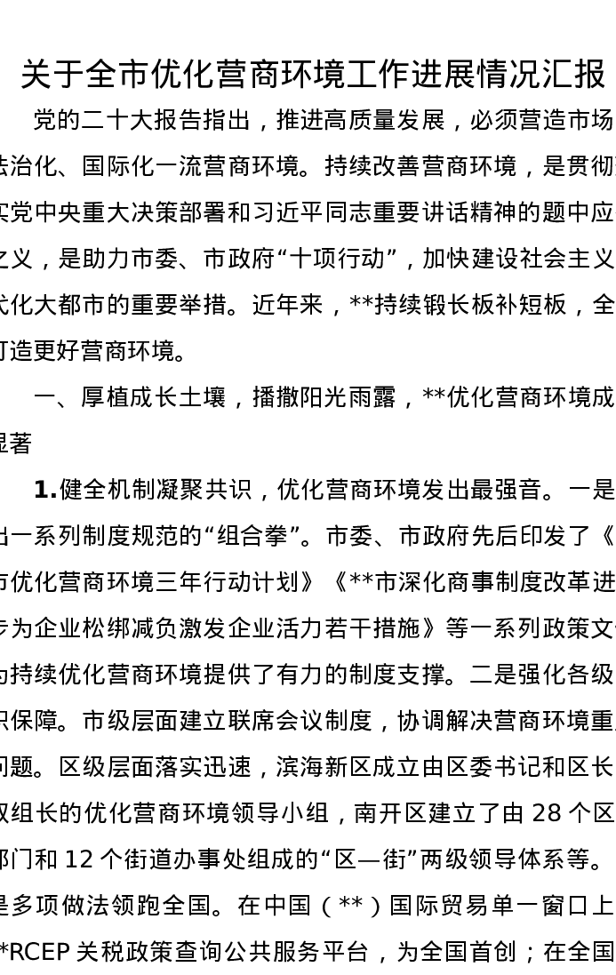 关于全市优化营商环境工作进展情况汇报