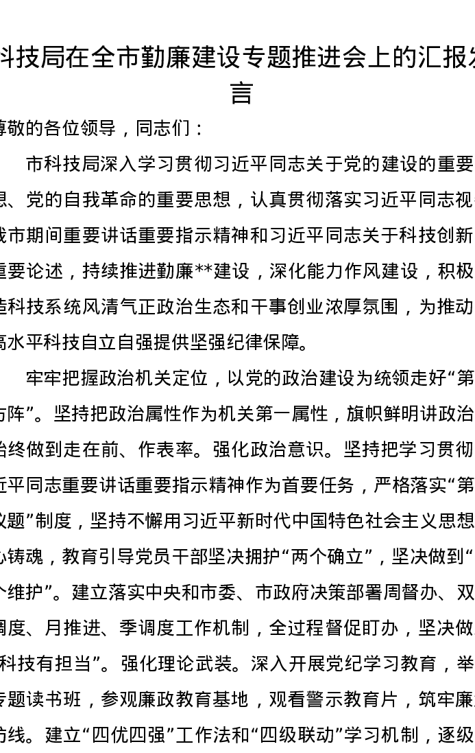 科技局在全市勤廉建设专题推进会上的汇报发言