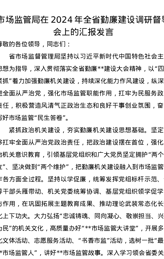 市场监管局在2024年全省勤廉建设调研督导会上的汇报发言