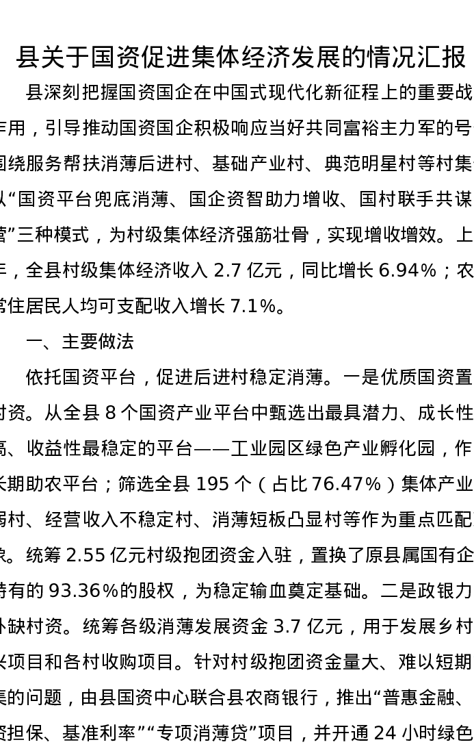 县关于国资促进集体经济发展的情况汇报