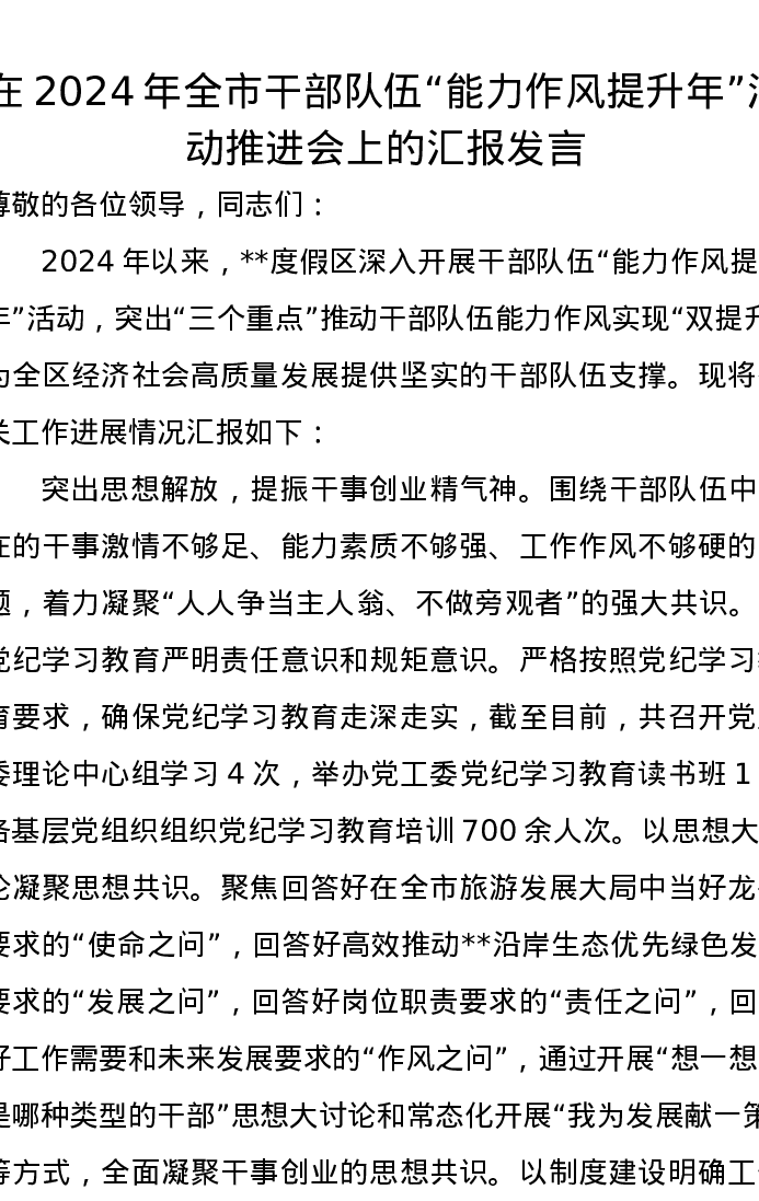 在2024年全市干部队伍“能力作风提升年”活动推进会上的汇报发言