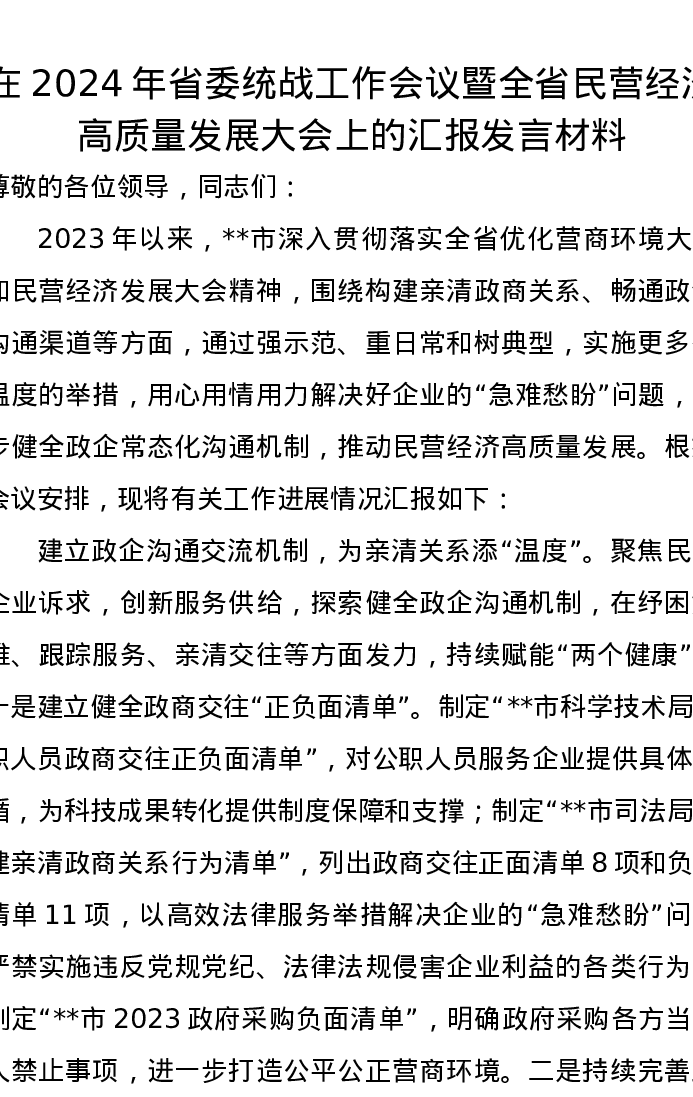 在2024年省委统战工作会议暨全省民营经济高质量发展大会上的汇报发言材料