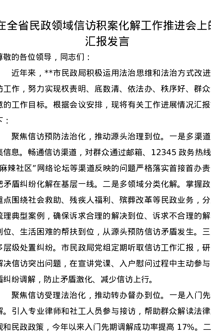 在全省民政领域信访积案化解工作推进会上的汇报发言